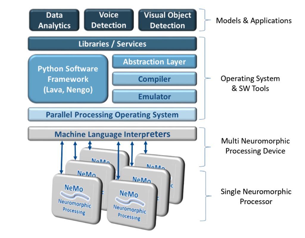 The NEMO Consortium implements the entire “value chain” for a neuromorphic processing platform (full stack) – from hardware devices, to the operating system and its interfaces and tools for various applications.
